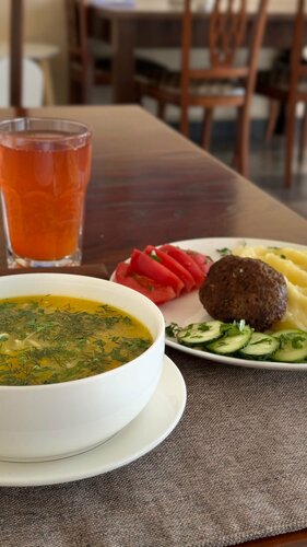 Комплексный обед: красный борщ со сметаной, макароны, отбивная, красный соус, салат оливье и компот