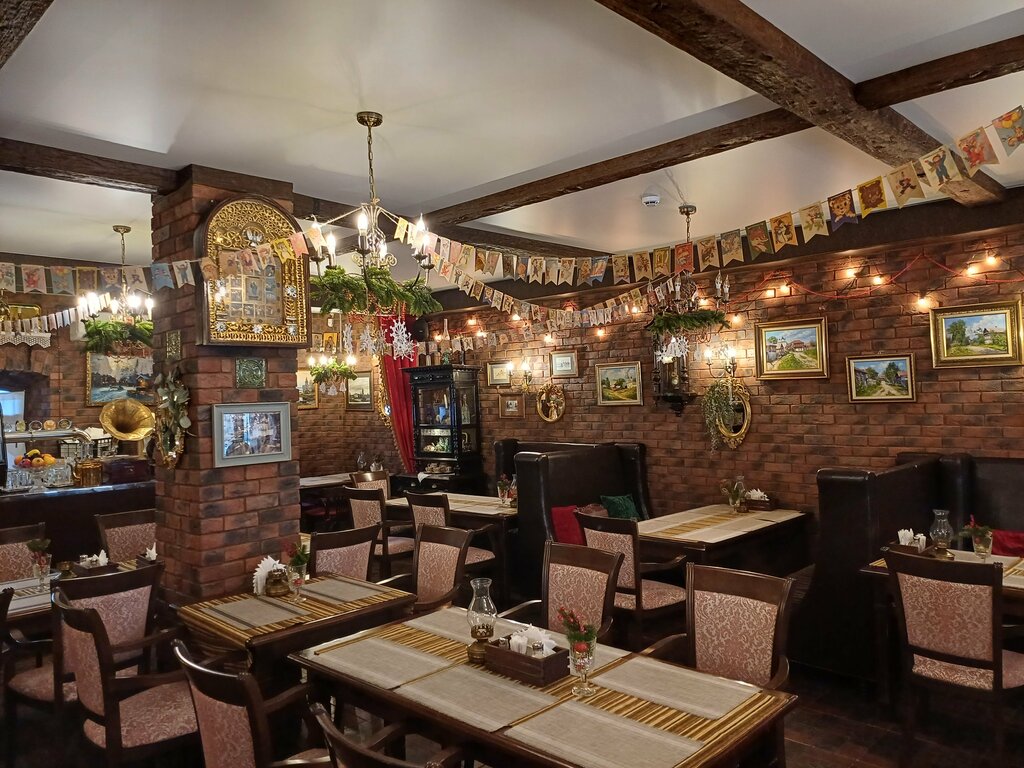 Интересное место, с очень красивым оформлением зала. Приятная советская музыка дополняет старорусский колорит ресторана. Официанты отзывчивые и вежливые. Заказывали склянку и судак запеченный с картофелем 1. Солянка не плохая , принесли очень быстро 2. Рыба с картофелем не соленая и с луком , хотя в меню не указан лук. Рыба костлявая 3. Медовуха не плохая , даже хорошая