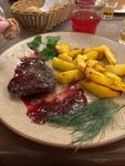 Шли без ожиданий и как обычно это самый лучший способ посетить заведение, чтобы составить объективное мнение. По меню- Пожалуйста сделайте нормальное меню(цветное, с красивыми картинками). Черно белые листочки с текстом не самого лучшего разрешения это в таком уютном месте- провал. Теперь по кухне: Брали салат с языком, курочкой и кедровыми орешками. Слопали его разом! Просто, но прям вкусно! Брали мясо говядины в двух вариантах с брусничным соусом и второй вариант с белыми грибами в сливках. И то и то просто объедение! Говядина не жесткая но и не разваренная! То что нужно, чтобы пожевать и почувствовать, что ты ешь мясо! Морс- вкусно! В общем если сравнивать с большинством ресторанов в Суздале, то тут максимально адекватные цены за вполне себе вкусную еду! Единственное, что расстроило это долгая подача. Сразу принесли салат и напитки а горячее ждали минут 20-25, от салата уже ничего не осталось, а кушать очень хотелось!😅 за это звезду снимать не буду! Рекомендую!