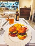 Два мини-бургера в картофельной булке с сочной котлетой из мраморной говядины, свежим салатом, овощами и крафтовым сырным соусом. Подаётся с картофелем фри и соусами кетчуп и горчица