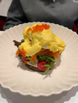 Тесто на оладьи готовим на основе пшеничной муки, кефира, куриных яиц с солью, сахаром. Подаем с фермерской сметаной и тремя видами икры: щучьей, красной и черной осетровой. Перед подачей посыпаем луком-сибулетом