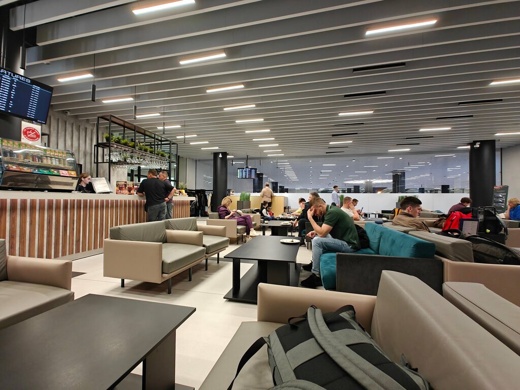 "Бюджетный" бизнес зал, расположен в стерильной зоне внутренних линий. Около 25 столиков, 100 мест. Туалеты, душ. Небольшой выбор еды - оливье, гречка, макароны, тефтели. Чай, кофе, земелах, кексики. Весь алкоголь (включая пиво) за деньги. Вечером в будний день поздней осенью мест хватает, был в ноябре 2024. Со столиков убирают, претензий к чистоте нет.
