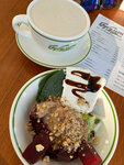 Написала менеджеру в чат,с уточнением будет ли комбо обед 3.11.25 и нужно ли бронировать столик,ответили что ждут нас без брони,я приняла это так что будет комбо обед,хотелось именно попробовать этот вариант,так как рядом работаю и на обед думала ходить именно в это место. Когда пришли в меню не увидела раздела на комбо обед,спросив у официанта,как и что,сказали что сегодня праздничный день 3.11 и такого варианта нет. Остались пробовать обычное меню,что могу сказать большинство позиций как в столовой,борщ,пюре с котлетой,селедка под шубой и тд,а вот цены дороже чем в столовой,так как концепция ресторана.Заказали запеченную тыкву, Салат с запеченной свеклой и Фетой и жульен В салате с свеклой было очень много уксуса,жульен как жульен, очень вкусный чай с вишней,понравилась подача блюд и само место,как будто советский кафетерий,очень уютно и светло,прогревает солнышко место хорошо,особенно если сидите возле панорамных окон. Надеемся в следующий раз попасть на комбо обед и стать вашими постоянными клиентами