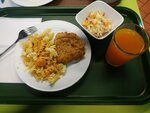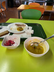 Суп одно название, курицу просто отварили(даже соли пожалели-ножку сами съели, только бедро, макароны самые дешёвые и переваренные). Салат витаминный норм- но его невозможно испортить - там только капуста и свекла)