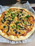 Решили пообедать перед вылетом. Заказали хачапури по аджарский, пиццу деревенскую. Хачапури не то, что вау, но есть можно. Пицца была так себе. Томатная паста была где-то намазана толстым слоем, бортики сухие, чёрствые, маслины нарезаны слишком крупно, как и грибы. Их количество и размер перебивает вкус. Мясная составляющая на фоне оливок можно сказать отсутствует. Зелень не все любят, в особенности петрушку. Фото пиццы на сайте и фото в реальности не похожи.