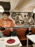 Были в кафе рядом с м. Парк Победы. Хороший вежливый персонал. Брали жареные пельмени, чебуреки с говядиной и курицей, кофе латте, соус сметанный и хворост. Единицу сняла за пельмени и сметанный соус. Соус невкусный, пересолен, пельмени тоже на вкус не на пять. Чебуреки хороши, жарят их прямо там недалеко от кассы, весь процесс виден и выдают быстро, максимум 10 минут. Была даже живая музыка, - рояль, с песнями из советских фильмов. Как и само кафе оформлено в духе СССР. на выходе порадовала телефонная будка с песней Позвони мне, позвони. спасибо!
