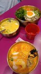 Рис с говядиной, овощами, древесными грибами, яйцом и белым кунжутом. Подаётся с острым соусом и горячим бульоном