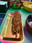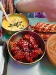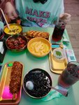 Очень долго вынашивала идею сходить сюда, и ни разу не пожалела! Место не просто оправдало ожидания, а превзошло их! Кимпаб с курицей - отвал бошки. Очень вкусно и сытно, даже без соусов. Привычные японские роллы мне не нравились из за рыбы и сыра, но этот ролл в основном из овощей и мяса на выбор - попал прямо в точку. Десерт с шоколадом тоже очень порадовал, сладко и вкусно, выпекли прямо перед подачей, он был ещё горячий! Но самое яркое впечатление - напиток. "Она ждала тебя" сделал мой вечер. Поразительно вкусный кисло-сладкий лимонад из земляники и каркаде. Подача очень интересная - чтобы подсластить кислый напиток, предлагается самому влить в него сладкий голубой сироп из шприца - выглядит очень занимательно:) Большую роль играет атмосфера. Не являюсь поклонником кпопа, но даже так место оставляет только восторженное впечатление. Оформление волшебное, неоновые вывески делают зал похожим на улочку ночной Кореи. Восторг! ✨✨✨