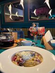 Очень приятное место! Минусов не заметила, одни плюсы! Сидели на летней террасе - понравилось! Играла легкая музыка, заказ принесли весьма быстро! Заказывали тыквенный суп с креветками- отличный👍орзо с говяжьими щёчками, с белыми грибами и чили, фитучини с цыплёнком, страчателлой и вешанками (самое вкусное из всего остального!) и салат с хрустящим баклажаном, домашним сыром, мятой и базиликом. Всё понравилось! Порции большие, сытные! И удивил синий чай (но это был не анчан!), называется тайский чай с черной смородиной. Оригинальный! 👍Местечко планирую посещать и всем советую! Обслуживание тоже хорошее. В общем побольше бы таких мест, толковых поваров и приятных официантов! Молодцы!