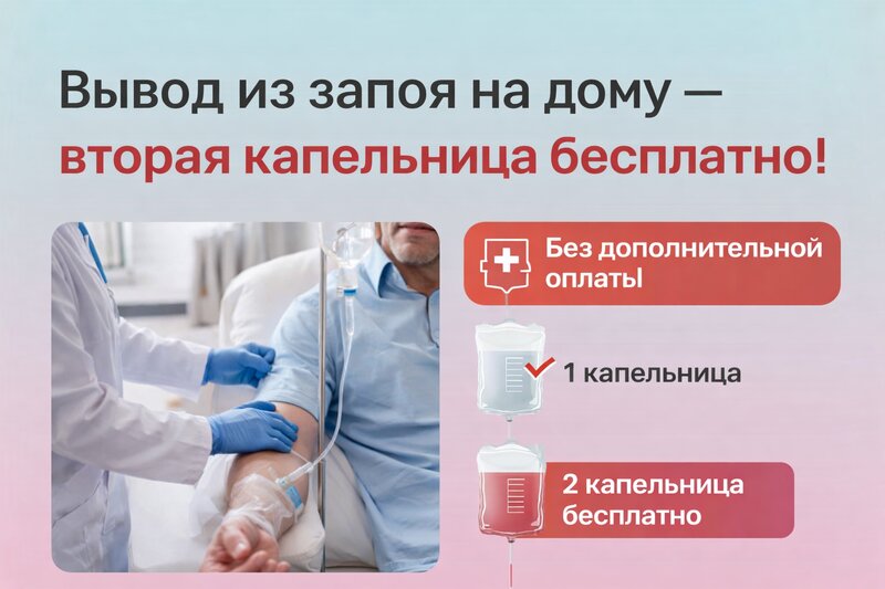 «Вывод из запоя на дому — вторая капельница бесплатно!»