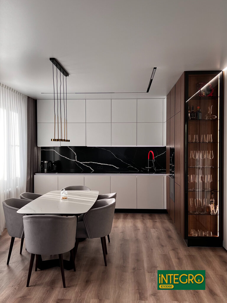 Стильная кухня с фасадами из шпона и эмали.Вся фурнитура Blum.
