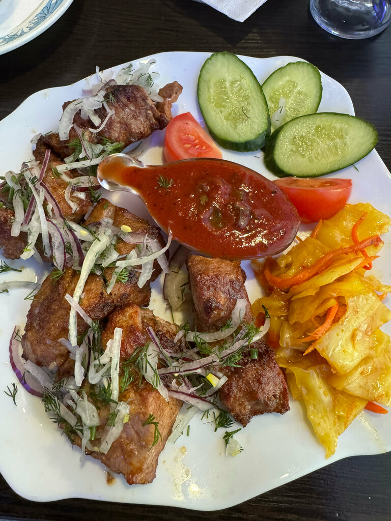 Были проездом, заскочили перекусить, взяли шашлык из индейки и шаверму на тарелке. Шашлык был сочный не пережаренный и не сухой, как надо, к нему подали лаваш и соус из свежих помидор со специями. Шаверма на тарелке много мяса, чесночный соус слегка островат, морковь по корейски и помидоры огурцы вкусны, дочери всё понравилось