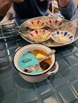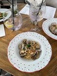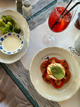 Само местоположение очень шикарное, на берегу озера. Мест много, как на веранде так и в самом зале. Оформление интересное, под средиземноморское кафе. Пришли практически под открытие примерно 12.15 и тут началась вечная история, администратор :" Бронировали? Сейчас посмотрим что можно сделать" Ковыряние в телефоне с умным видом, разглядывание зала. "Можем предложить вот этот столик", он около кассы и соответственно постоянное хождение. " Около окна столы свободны? " - Сейчас посмотрю, да пожалуйста". Почему сразу нельзя нормальные места предложить, а тянуть прелюдию на 10 минут? Официант подошла быстро, вроде Карина, доброжелательная, меню знает подсказала по блюдам. Понадобилось дополнительное меню, попросил не "нашего" официанта, он посмотрел на меня как на "врага народа"))). Заказали: томатный суп с крабом, корюшку, сибаса, пиде, лимонады, вкусно слов нет. Был ещё запечённый картофель с форелью - вообще никак. Общее впечатление: уютно, вкусно, атмосфера доброжелательная, чуть меньше пафоса администраторам и отлично!)