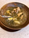 Щи из щавеля с картошечкой и свиными ребрами. Традиционно подаются с яйцом и сметаной