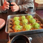настоящий угорь в соусе унаги на пицце в компании с моцареллой и соусом из этого же угря, украшено кунжутом и шнитт луком