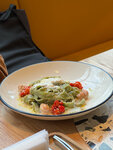 Замечательное заведение. Давно хотела побывать здесь. Официанты тактичные , вежливые. На ресепшене прекрасные девушки встречают. В ожидании были недолго. Поэтому без записи вас обслужат. Еда превосходная и недорого по чеку. Спасибо официанту Алексею. Атмосфера приятная. Советую сходить. Пробовали пасту и салаты , очень вкусно . Попробуйте фирменный лимонад крыжовник с апельсином 👍