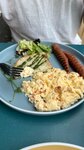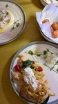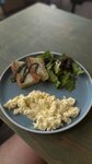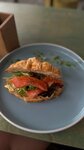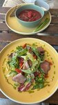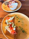 Ели том ям и томатные вафли с омлетом, очень сытно, вафли вкусные, жене тоже очень понравился том ям, очень понравилось, что кухня открытая, очень приветливый персонал, еду принесли быстро, в заведение можно приходить со своим питомцем.