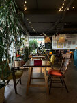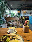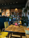 Были на завтраке. Большой выбор утренних блюд, и приятным сюрпризом стало, что можно заказать любую позицию из меню. Пробовали блинчики с ягодами, вафлю с фруктами, томатную вафлю с лососем, бургер, шакшуку, омлет. Подача очень быстрая. Все было вкусным, но порции небольшие. Цены средние. Флэт вайт замечательный - крепкий, насыщенный с хорошей пенкой. Какао как в детстве!) Интерьер очень приятный и полностью отражает название заведения: много дерева в интерьере, живых растений и занятных рисунков и картин в терракотовых и охристых оттенках. Приятное место во всех отношениях.)