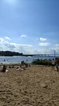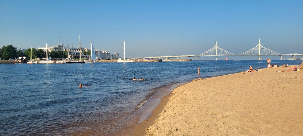 Хороший благоустроенный пляж, в черте города, в шаговой доступности от м. Зенит или Крестовский остров. Красивый вид на залив и мост. Есть волейбольная площадка, большая зона с тренажёрами, смотровая площадка, скамейки, зелёная зона. Минус за раздевалку, слишком уставшая, огромные щели, которые частично заделаны скотчем, лентой, даже матрасом надувным. И много проходит мимо разнообразнвх судов и водных мотоциклов, нагоняют волны. Туалет бесплатный.