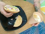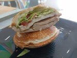 Не вкусно и пресно Брали с подругой Она сэндвич с пашотом закрытый,а я с рыбой Рыба пресная,безвкусная Так ещё и вдобавок с костями… Ладно,если бы одна попалась ещё Там их 4 шт Это не с заботой о гостях Я то не проглотила А если возьмёт ребёнок или в принципе человек и проглотит Кость может поперек горла встать Их удобно держать,ибо начинка не вываривается,как в сэндвичах по классике,но это максимум положительное в этой истории Больше сюда не зайду Не ответственный подход к работе к и не уважительное отношение к потребителю