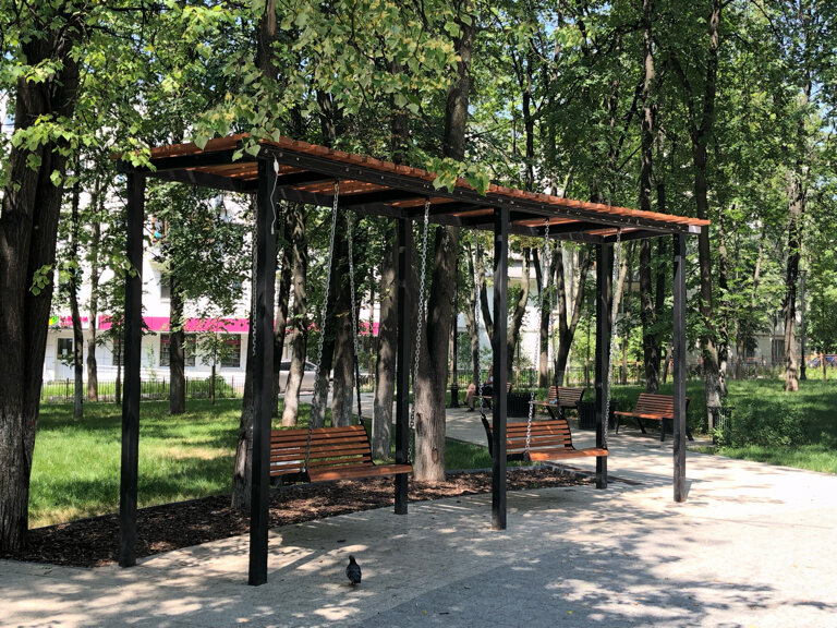 Маленький сквер. Походить минут на 10-15. Есть лавочки и качели. Зимой пусто, летом более людно. Рядом остановка общественного транспорта, магазины и аптеки