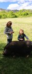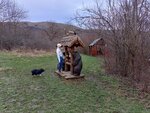 Миленькая фотозона с деревянными скульптурами, домиком и телегой. За забором пасутся свинки с поросятами, которые не прочь полакомиться вкусняшками.