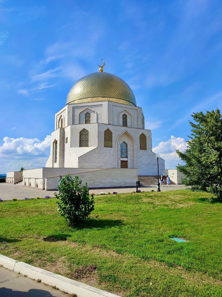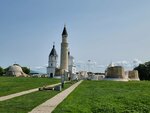 Соборная мечеть.    От музея Корана к Соборной мечети ведут 2 паралельные дорожки. Обратите внимание, между ними стоит стенд с прозрачным стеклом. На стекле нанесено изображение мечети, когда она еще не была разрушена. Так вот, если присесть и совместить в данный момент целый высокий минарет с ним же на рисунке, то можно понять какого размера и какой высоты была сама Соборная мечеть!    Еще один момент. Подойдя уже к развалинам самой мечети можно увидеть красную линию на стене. Ниже красной линии "родные" камни стены, выше - достроенные в наше время. Так же старые камни легко определить по цвету - они серые, а новые - белые.    В контуре мечети можно увидеть где были колонны.    По современным меркам Соборная мечеть невелика, но по временам Волжской Булгарии размеры грандиозны!    Полностью восстановлен большой минарет, на который можно подняться.