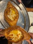 Хачапури из дрожжевого теста в форме лодочки с начинкой из трех видов домашнего сыра, яйца и сливочного масла.