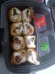 ужасно, я больше никогда не буду заказывать тут суши. одного фото я думаю достаточно. соус пролили, васаби с имбирём лежат в одном кантейнеры с сушами, что является нарушением. в другом имбирь разбросаны по контейнер вместе с васаби. ребят, вы сами будете это есть потом?!