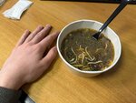 Не оказалось рамена Бифу шичу… Взял с говядиной. На вынос просто смешно на сколько маленькая порция! (Меньше моей руки) По вкусу обычный соленый бульон.