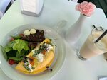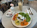 С томатами черри и шпинатом под апельсиновой заправкой. Подаётся на злаковом хлебе, украшен кедровыми орехами, укропом и хлопьями чили || яйца, томаты черри, авокадо, лосось с/с, шпинат, кедровый орех, заправка (масло оливковое, сок апельсина, уксус