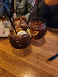 Бронировали заранее столик на компанию, когда пришли — сотрудник просто сказал искать свободные места самостоятельно. Какое-то безумное количество людей, к бару не протолкнуться, бармены просто не успевают отдавать заказы. Коктейли на вкус — как вода, алкоголь не чувствуется.