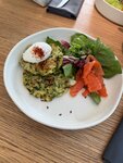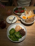 Уютное место с хорошим обслуживанием и вкусной едой: - интерьер - светлый зал с большими окнами, зеленью и элементами дерева. Посадка комфортная, столы достаточно большие, все помещается. Гости друг другу не мешают. - меню - были на завтраке, меню обширное на любой вкус: несколько вариантов скрембла с разными допами, шакшука с греческим йогуртом, омлет, несколько вариантов каш, Бенедикт, драники, в том числе из кабачков в пашотом, зеленая гречка с пашотом и авокадо, тосты, круассаны, запеканка из рикотты, безглютеновые сырники, бутерброд с икрой, все блюда очень сбалансированные. - еда - драники из цукини- добавила лосось к ним, подача с пашотом и зеленью. Драники не жирные, зелень свежая, лосось нежный, не пересоленный. Бутерброд с красной икрой - икры не жалеют, хлеб можно выбрать на свой вкус. Сырники - творожные, мука не чувствуется, не сладкие, сверху конфитюр из земляники и сметаной (есть и иные варианты), рассыпчатые и не сухие. Попробовали десерты (сложно удержаться, выглядят они очень мило :) ), муссовые с разными начинками, приятно, что у всех блюд есть кбжу. - персонал - очень дружелюбный, вежливый, оперативный. Подача блюд достаточно быстрая. Место оставило очень приятное впечатление: атмосфера, еда, обслуживание - все было отлично, чтобы начать день с приятных эмоций.