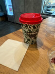 Вообще замечательно, что они в принципе тут открылись, а то кафе в районе откровенно изобилием не радовали. Кофе только одного объёма 0,3. Есть выбор пирожных. Сами пекут круассаны. В зале чисто. Но фоном идёт плейлист с советско-российской эстрадой с нотками шансона. И если вы захотите поесть в зале, то стаканчики будут все равно одноразовые. Зато по ценам всё очень бюджетно.