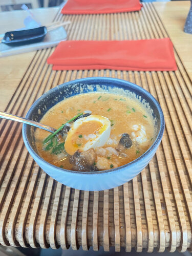 Заказала б/л Очень свежие вкусные ролы; вкусный суп; рис с морепродуктами чуть меньше понравился, слишком этого для меня. Обалденный зеленый чай. Придем обязательно еще