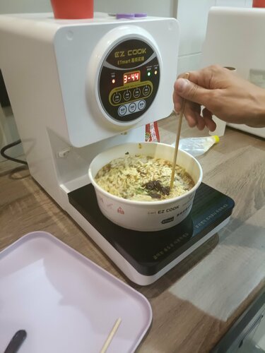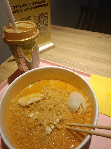Интересное заведение с необычной концепцией. Где ещё вы придёте в кафе чтобы самостоятельно приготовить себе еду) Зал ярко оформлен в японском стиле. Выбор лапши большой, есть и китайская, и корейская и японская. Степень остроты также можно выбрать по своим предпочтениям. При этом вы можете как сами выбрать так и получить консультацию у сотрудников. Далее при желании необходимо выбрать добавки, выбор тоже разнообразный. Ну а после все в ваших руках и остаётся приготовить лапшу на плиточке. Если в первый раз вам все обязательно расскажут, подскажут и проконтролирую, чтобы вы все правильно и вовремя добавили и получилось вкусное блюдо. Я брала сырную лапшу, добавила ещё плавленный сырок, курочку и маринованное яйцо. Получилось бомбически нежно, сливочное и вкусно🤤. Так как заведение открылось не так давно, то сотрудников всего двое, один в зале и второй на кассе и стойке с добавками. Немного маловато когда приходит сразу человек 8 балбесов как мы и приходиться драться за внимание и помощь🤭 думаю все со временем наладят. Обязательно придём ещё)