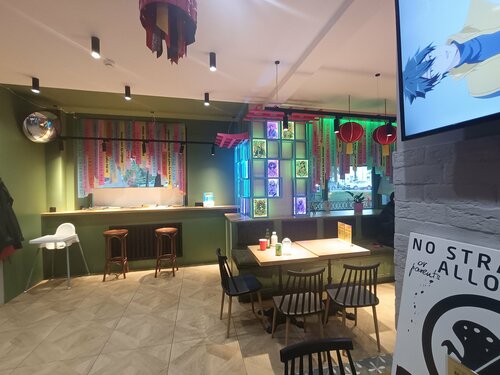 Впервые посетила данное заведение. Несколько небольших залов минималистично украшенных в японском стиле. Есть даже зал где на стену проекцируют аниме, все на том же японском языке, так что если не любите эти "прекрасные" вскрикивания лучше идите в первый зал, где играют просто японские песни) однако стоит что-то сделать с вытяжкой, т. к. в первом зале пахнет специями и горелым фритюрным маслом. По еде: есть выбор нескольких видов раменов и различные добавочные закуски. Удобно что есть выбор стандартной мега порции и поменьше если пришли поесть одни. Так же можно выбрать степень остроты блюд. Рамен был очень вкусный, насыщенный наваристый бульон. Гёдза со свининой тоже понравились. Ещё брали своеобразный десерт "банан с тофу" - не обычно, но вкусно. Однако очень разочаровала кимчи, хуже чем здесь не пробовали нигде. Куча специй, непонятные части капусты, вообще не вкусно( зайдём ли ещё раз - спорный вопрос