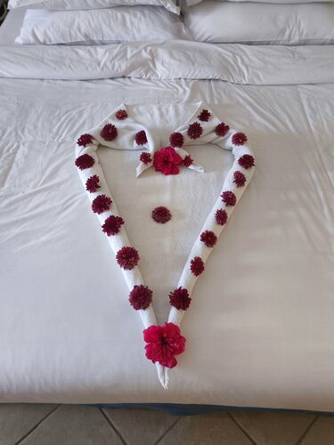 Всем привет! 14 дней отдыха Отель новый,но ужасный! Номерной фонд,1 🌟 Сначала заселили в 4469 ,шумоизоляция 0,с 5 утра включают вытяжку из кухни,гул не для слабонервных,при закрытой двери балкона слышно все проезжающие авто и крики персонала,в ванной когда моешся вода льется рекой из всех щелей ,в раковинах умный смеситель,при включении можно ополоснуться целиком,вода в разные стороны,но не в слив(новый отель). Поменяли номер через 2 бессонных ночи. Дали номер 4466-надеялись на лучшее,но к сожалению всё тоже самое,но ещё и рядом с лифтом и лестницой! Ночью когда в номере темно входная дверь светится как в раю,но закрытая в него)) Уборка номеров ,2 🌟 Будьте готовы к тому что в 9 утра к вам вломиться уборка и им всё равно что вы спите!(У вас будет ровно 2 секунды до открытия двери после двух стуков в дверь!!(Даже если табличка"не беспокоить"на двери).убирают всё отной тряпкой,он же метла,он же совок,он же тряпка! Территория,1 🌟 Пойти некуда,гулять негде,просто тупо сидеть за столом или на диване. Еда.2 🌟 Супы- это что то нечто из всего что осталось с прошлого дня.Пюре -либо пересолено,либо не доварено,либо пересушено!как так можно приготовить? Крабы на гриле-зажаривают так ,как будто активированный уголь (чтобы изжоги не было),вкус для экстрима. Морепродукты -это месиво из рыбы,сладкого перца,морковки и мелко рубленых непочищенных кальмаров,без креветок! Алкоголь -бодяжный,пиво норм в банках,выдача в одни руки 1 банка (0,33) Разливное тоже норм Пляж-(в пирамисе)5 🌟 До пляжа в пирамисе чтобы добраться -это квест,ездит Шатл 1 раз в час на 26 человек без окон и дверей,кто успел -тот за пол часа пришел) Дорога до пляжа 10 минут занимает по стройкам Сахла,на поворотах можно выпасть,были случаи! Сам пляж норм ,заход в море песок, дальше кораллы с огромным количеством красивых рыб(это самое лучшее в этом отеле) Анимация 0 🌟 Её просто нет,2 аниматора на пляже с утра на 30 минут,из них 10 минут типа зарядки,10 минут покидать шарики в песок( для фото) развлекуха так себе. в отеле ходят из угла в угол сами не знают чем занять людей. Есть дартц 10-15 минут и какой-то ручной деревянный хоккей (никому не интересно) Хоть бы шашки,шахматы,нарды выдали отдыхающим!) Но вечером появляются все аниматоры перед вечерним шоу,и после шоу не заменимая Ламбада для гостей👯😭. Мини диско для детей тухлое,интереса к детям нет,аниматоры сами друг у друга учатся движениям! За 14 дней ,один раз проводил Мини диско аниматор Мики,который зажёг интерес и восторг у детей! Такое чувство, что аниматоры там отбывают срок! Бармены отличные, официанты так же,но есть и попрошайка один ,который на улице работает,большой и толстый!после закрытия основного ресторана,торгует пивом по 1$! Шоу которые проводятся более менее заходит от скуки в отеле! В общем оценка 1 🌟 и это только из за пляжа! Первый и последний раз в этом отеле!