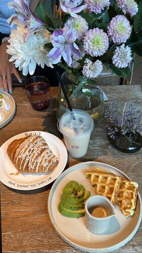 были в cups впервые. первое, что сразу бросается в глаза — интерьер. видно, что в атмосферу вложено много сил: уютная обстановка, много живых цветов — это действительно радует и создает приятное впечатление. понравилась и зона с водой, где можно налить лимонную или грейпфрутовую — отличное решение для тех, кто не всегда хочет кофе или сладкие напитки. что касается кухни — к сожалению, впечатления оказались не такими положительными. десерты и выпечка с витрины не впечатлили: круассаны показались посредственными. кофе разочаровал — раф был больше похож на растворимый напиток из пакетика, чем на качественный кофе. картофельные оладьи оказались слишком жирными, буквально пропитанными маслом, что совсем не сочетается с образом «здорового» и легкого меню, которое ожидаешь в таком месте. почему кофе подают в пластиковых стаканах. внутри. в пластике! это позорно. уровень совсем не казанский, уж извините. в целом у заведения отличный потенциал: атмосфера, интерьер и внимание к деталям радуют. очень хочется, чтобы кухня соответствовала этой планке — тогда cups станет местом, куда захочется возвращаться снова и снова.