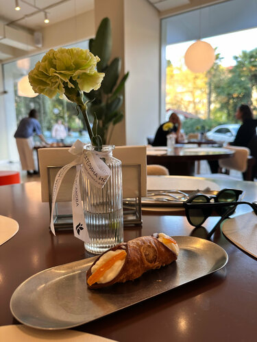 Мне здесь понравилось. Персонал встречал хорошо, помогли с выбором обо всех вкусах и десертах рассказали. Кофе отличный , зерно - топ. Интерьер приятный, современный, чистые туалеты. Везде зеркала. По еде - сендвич , который заказал супруг понравился , он был с сыром и баклажаном. А вот мой круассан с форелью - мне не зашел. Вкус оказался пресный, не было ничего яркого, чувствовался только вкус круассана. Как будто не хватило какой-то заправки, или какого-то более яркого соуса. Но это опять же - на мой вкус, кому-то может быть наоборот это понравится. Десерт вообще вау , по-моему это называется канноли. Цены демократические, чуть-чуть меньше чем в других местах, совсем чуть меньше ) Приду сюда обязательно ещё за кофе и буду дегустировать другие десерты .
