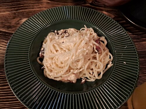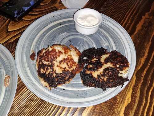 Интерьер необычный и интересный. На этом ВСЁ. Кто пишет хвалебные отзывы? Вся еда не солёная, от слова совсем. Драники принесли горелые, мы их вернули, но из счета их не убрали. Солянку вообще не принесли, и тоже в счёт включили. Торты ужасные, коржи старые, крем точно не на сливках или сметане, чувствуется химозный вкус, маленький кусочек вышел на 300руб. Карбонара не вкусная. Одни пельмени были нормальные, но так же совсем без соли. Картошка фри мелко нарезана и пережарена. Администратор с таким лицом перечитывала, и даже элементарно извинится, не хватило воспитания. Не рекомендую это заведение.