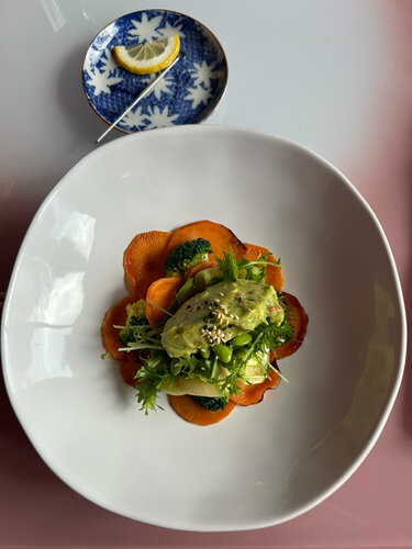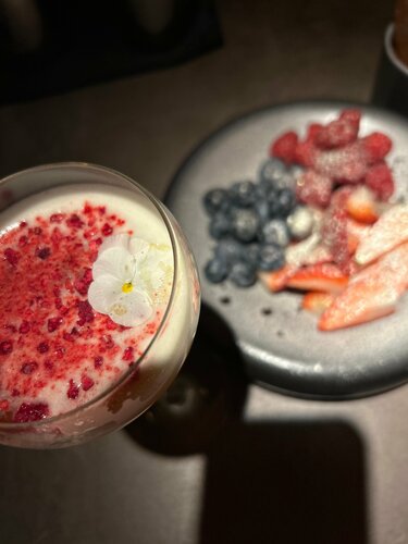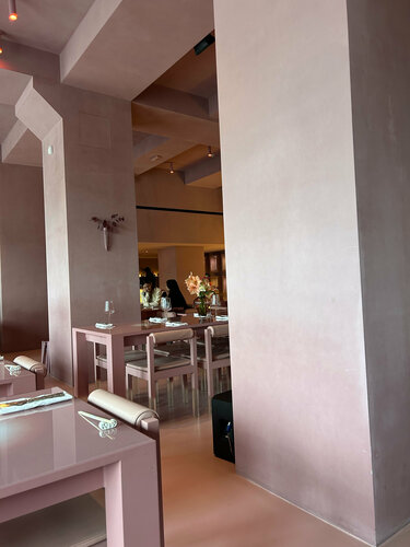 Пудрово-розовый сдержанный интерьер , ничего лишнего, не очень много деталей, но тем интереснее. Вкусно, очень приятные, отзывчивые официанты . Внизу есть бар (нужно бронировать столик заранее) с другим интерьером , уже более темным «вечериночным» что ли)) , dj пульт и курительная комната с заранее приготовленными несколькими видами сигарет. Будучи некурящими , нам уж очень захотелось прочувствовать эту атмосферу 😜 С удовольствием еще не раз зайду к вам! Спасибо)