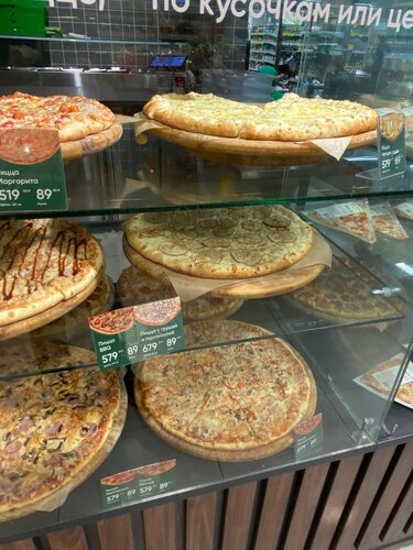 Внутри магазина есть кафе, в кафе есть пицца, но купить и съесть её не получилось, Всё как в старом анекдоте, тот кто пиццу испёк есть, тот кто егё может продать есть, а вот тот кто её должен порезать ушёл. И всё, стоят семь человек ничем не заняты, но пиццу никто из них не режет, ждите специального человека. С шаурмой тажа история.