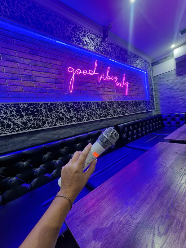 Мне все понравилось, были в кабинке, мы не профи , а любители , нас все устроило по звуку. Кухня 10/10. Все было вкусно и медальоны, и суши, и салаты. Только за чай с молоком 1/10. Сейчас почему то хороший чай с молоком трудно найти. Цены средние. За отметку в инсте цена за час аренды кабинки 180 тг. Список песен обширный, нашли все ,что хотели. Обслуживание быстрое , есть кнопка вызова официанта.