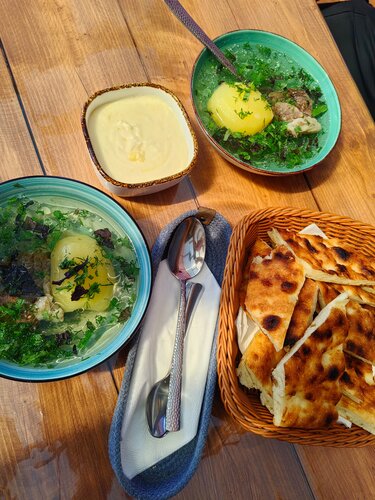 Очень вкусно. Лывжа на наваристом говяжем бульоне с ароматной свежей зеленью - просто великолепно. Плюс Дзыка из осетинского сыра. И... мы вдвоём переели. Чай не поместился. Цены доступные. Обслуживание быстрое. Спасибо за вкусный обед)))