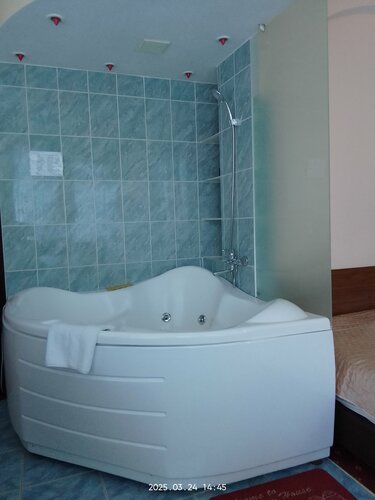Отдыхаем с сыном с 24.03 по 29.03. Сняли номер с джакузи. В номере телевизор, холодильник, посуда, два мягких стула и стол, туалет в номере, есть балкон один на два номера, вид на море. Особенно приятно наличие подогреваемого бассейна в отеле (глубина около 150 см). Тапочки и халаты предоставил отель, что очень удобно. В стоимость проживания включён сытный завтрак: каша, яичница, сосиска и йогурт сегодня были. Кулер с водой и микроволновка в коридоре. Нам все нравится.