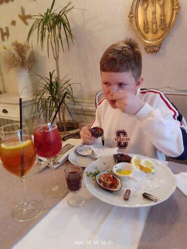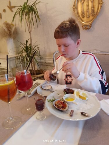 Сходили с сыном 23.03 попробовать устриц и морских ежей в данное заведение. Кафе атмосферное, внутри светло и уютно. Официант и управляющий внимательные и приветливые. Всё рассказали и порекомендовали. Продукты свежие, подача красивая. Ели ежей, устриц, гребешки, анадару(тартар). Взяли айс ти. Потратили 4500. Остались довольны.