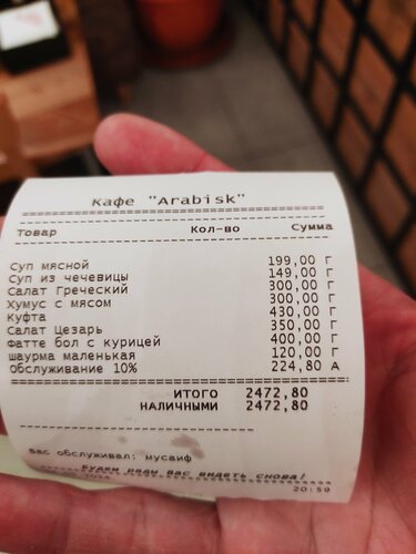 Интересное место, готовят временами хорошо, если есть в зале блюда большие, если берешь с собой блюда становяться меньше за туже цену. Для кафе цены немного выше среднего. Не понравилось что в салат за место маслин, как у них же указано, положили оливки(некоторые люди не едят оливки и читают состав блюда) и самое главное испорченные оливки, это очень омрачило мнение об этом месте. И девушка официант посчитала в обслуживание все позиции, хотя половину мы заказали с собой