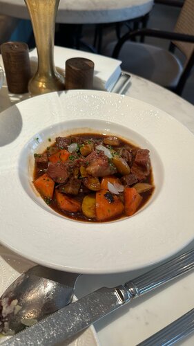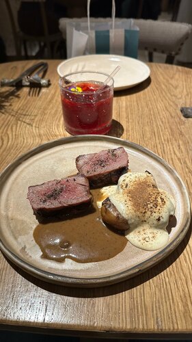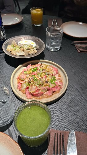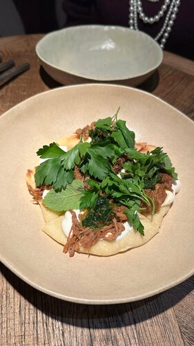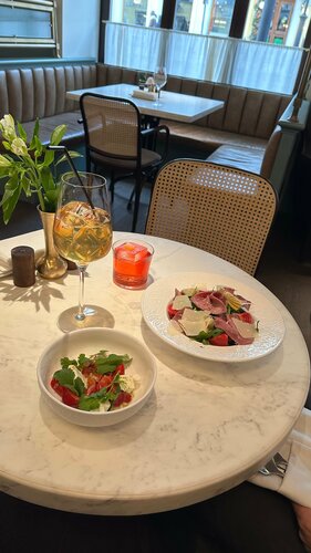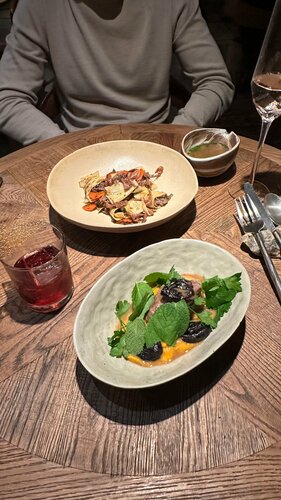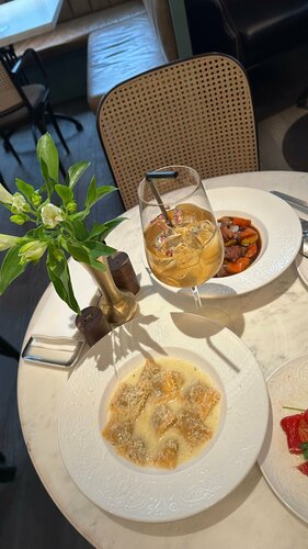 Уютный итальянский обед в De Torino Салат с ростбифом и артишоками с соусом тоннато гораздо интереснее классической версии; пармезан как вишенка на торте, давно забытый вкус Италии💔 Равиоли пьемонтези образцовые, давно таких вкусных в России не ели, мясная начинка одновременно нежная и насыщенная, а паста держит структуру. Если очень придираться, то соус можно было сделать погуще, чтобы он не оставался в тарелке (потому что вкусный!) На основное блюдо из сезонного меню брали - мясо с корнеплодами и грибами, остались очень довольны. Отсылочка к бёф бургиньон, не иначе.  Завершили всё десертом - тирамису негрони: лёгкий, нежный, алкоголь не чувствуется (если важно) и насыщенный вкус хорошего горького шоколада🤤 Лучший тирамису в городе (после того что готовит моя жена)😇 Обстановка уютная и стильная а ля французское бистро (основной зал и отдельная барная зона), персонал приветливый, рекомендую всю сеть Fitz Gastro Project. Ребята молодцы, устраивают разные бранчи, дни со скидками на вино и коктейли и много всего интересного🫶🏻 Коктейли с воскресенья по понедельник по 500₽!