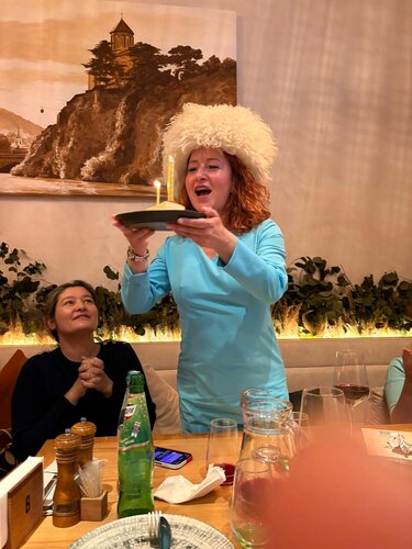 Отмечала здесь свой день рождения. Очень довольна. Мне нравится ресторанам тем, что здесь замечательная, очень теплая доброжелательная атмосфера, внимательное обслуживание. У нас был официант Самир. Отдельная сердечная благодарность ему, а также Бахе. Девушки хостес тоже чудесные. Самир помогал сориентироваться по блюдам. Все быстро готовится и выносится. Для меня, как для именинника, было очень трогательно то, что меня поздравили ребята и надели на меня грузинскую шапку. Все это было очень тепло и позитивно. Также порадовала скидка в 20% именинникам. Блюда очень хорошие. Хинкали таяли во рту. Соус великолепный. Интересная трактовка салата с креветками на грузинский манер. Все вкусно, достойно, душевно. Рекомендую!